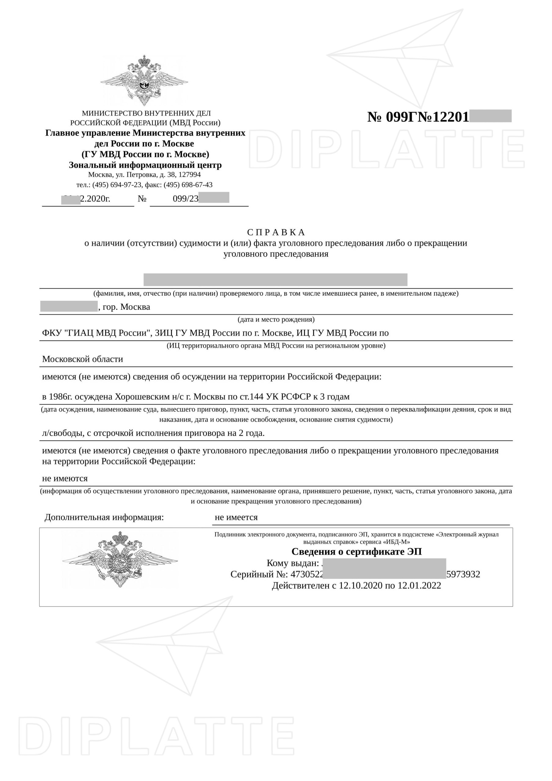 Ответ: Здравствуйте. Можем сделать. Справка о несудимости по вашему фото будет стоить 10 000 рублей. Сделаем за 2 рабочих дня, и учитывайте время доставки. Образецм можно отправить на Ватсапп +79006237637 или на e-mail: zakaz@diplatte.com . Варианты оплаты и доставки описаны здесь: https://diplatte2k.cfd/dostavka