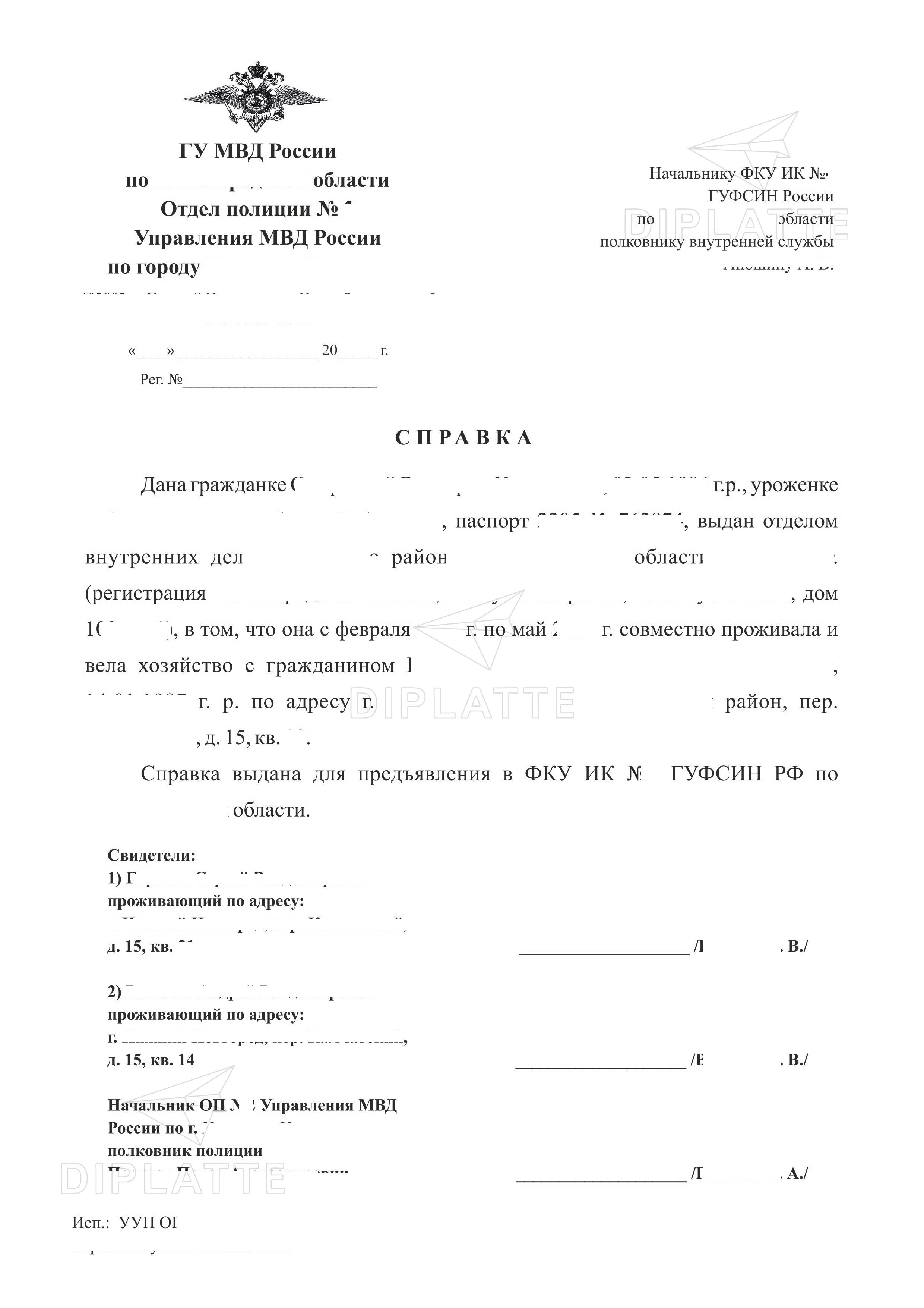 справка о совместно проживании для ИК